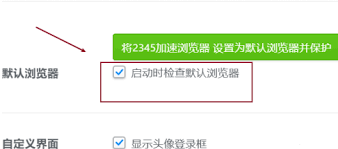 在“启动时”板块里,有一个“检查是否为默认浏览器”的选项。将该选项勾选上,这样当每次启动2345浏览器时,它就会自动检查当前系统的默认浏览器是否为自己。