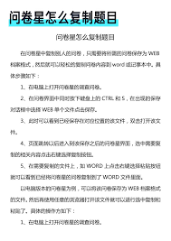 在使用问卷星进行问卷调查的过程中,有时我们需要将问卷题目下载为word格式,以便进行进一步的编辑、整理或分析。以下是具体的操作步骤: