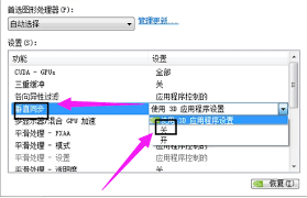 4. 选择关闭:将“垂直同步”的设置从“使用3d应用程序设置”或“自适应垂直同步”改为“关”,即可关闭垂直同步功能。